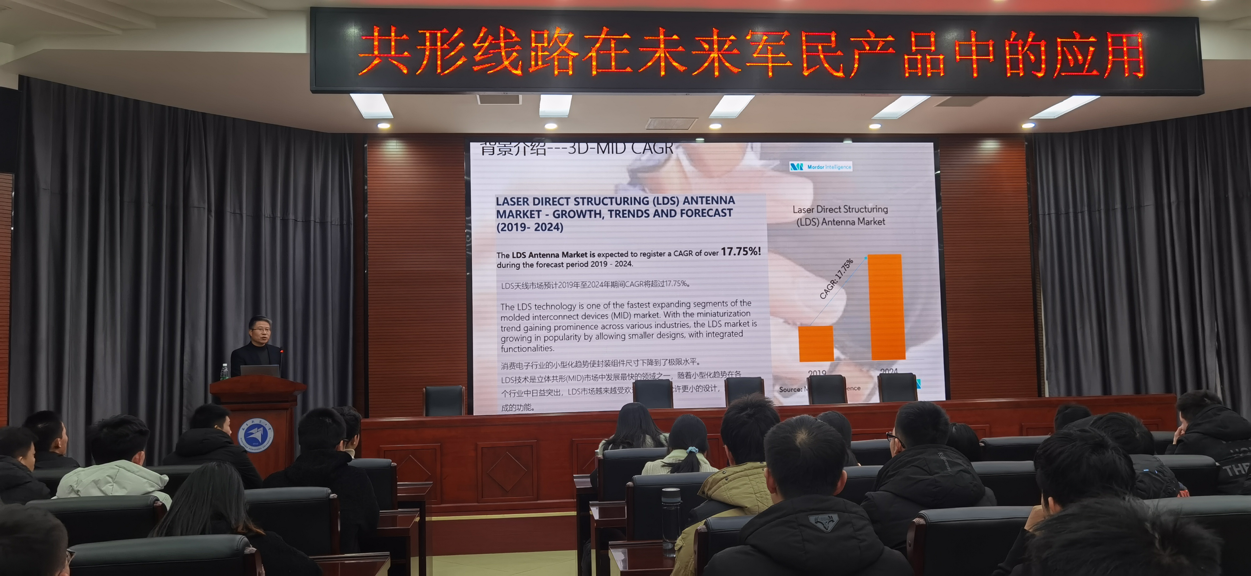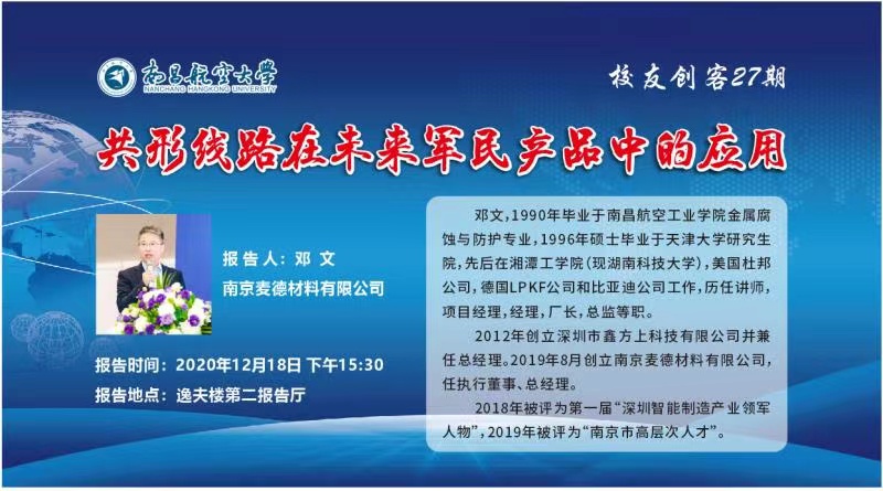 2020年12月18日 下午15:30,鄧文總經(jīng)理參加南昌航空大學(xué)校友創(chuàng)客講座,在逸夫樓第二報(bào)告廳為全校師生做報(bào)告《共形線路在未來(lái)軍民產(chǎn)品中的應(yīng)用》,鄧總結(jié)合自己的親身工作經(jīng)歷,為師生們深入淺出地講解了立體線路的特點(diǎn)及在工業(yè)制造,5G技術(shù)、智能汽車、軍事領(lǐng)域的應(yīng)用,希望同學(xué)們?cè)趯W(xué)習(xí)中擴(kuò)展知識(shí)面,勤學(xué)多思,在最好的時(shí)代綻放最美的自己。